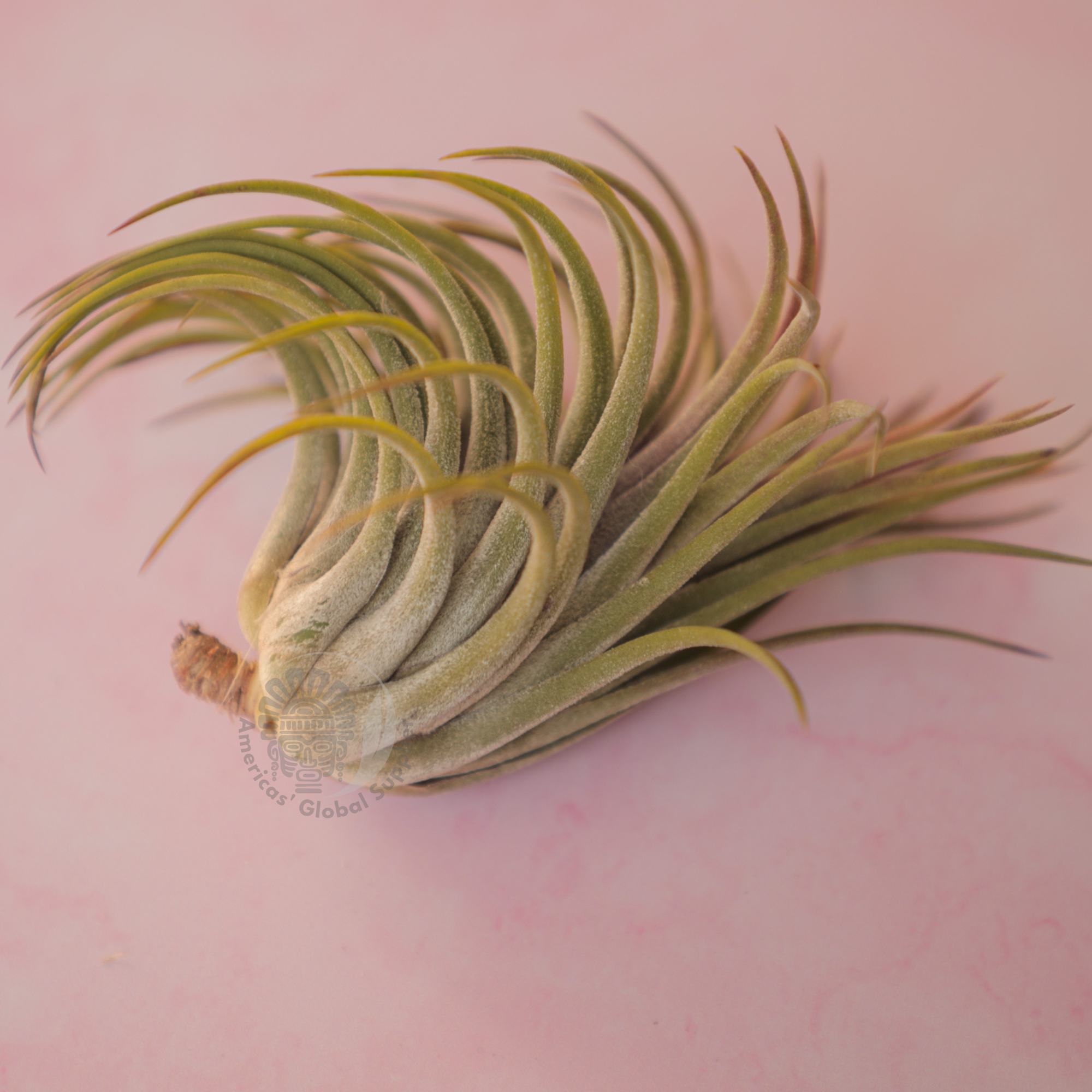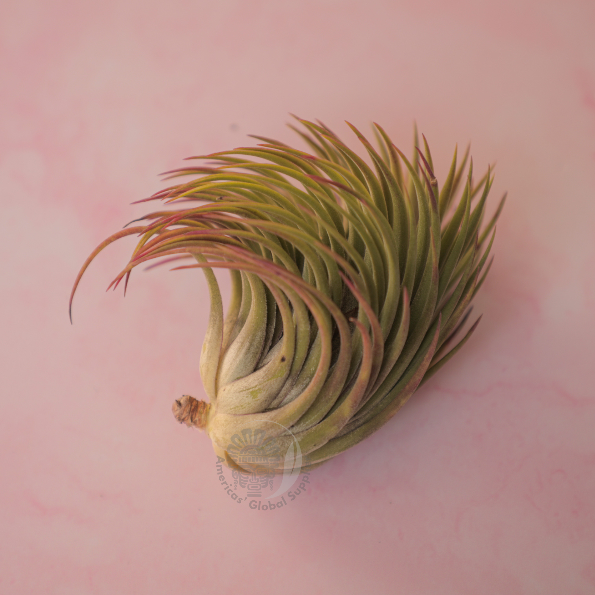 Tillandsia or Air Plant Ionantha Scaposa is a botanically unique species originating from Central America. It features light green leaves, slight blush, creating a characteristic structure that makes it instantly recognizable. Its coloration shifts with light exposure due to trichome density, allowing tones ranging from bright green to silvery or reddish hues. When blooming, it produces purple flowers, adding vibrant ornamental value. As an epiphyte, its morphology—including leaf rigidity, water storage capacity, and trichome patterns—reflects evolution in challenging environments. For care, it thrives in high light, benefits from strong airflow, and prefers warm temperatures. This species is both decorative and resilient, making it excellent for creative interior or outdoor mounting displays.